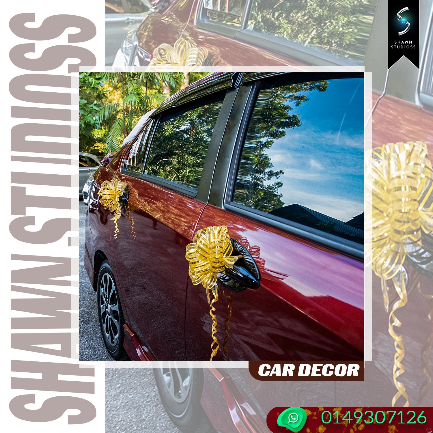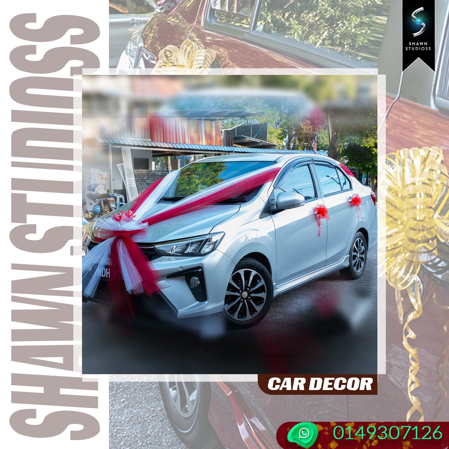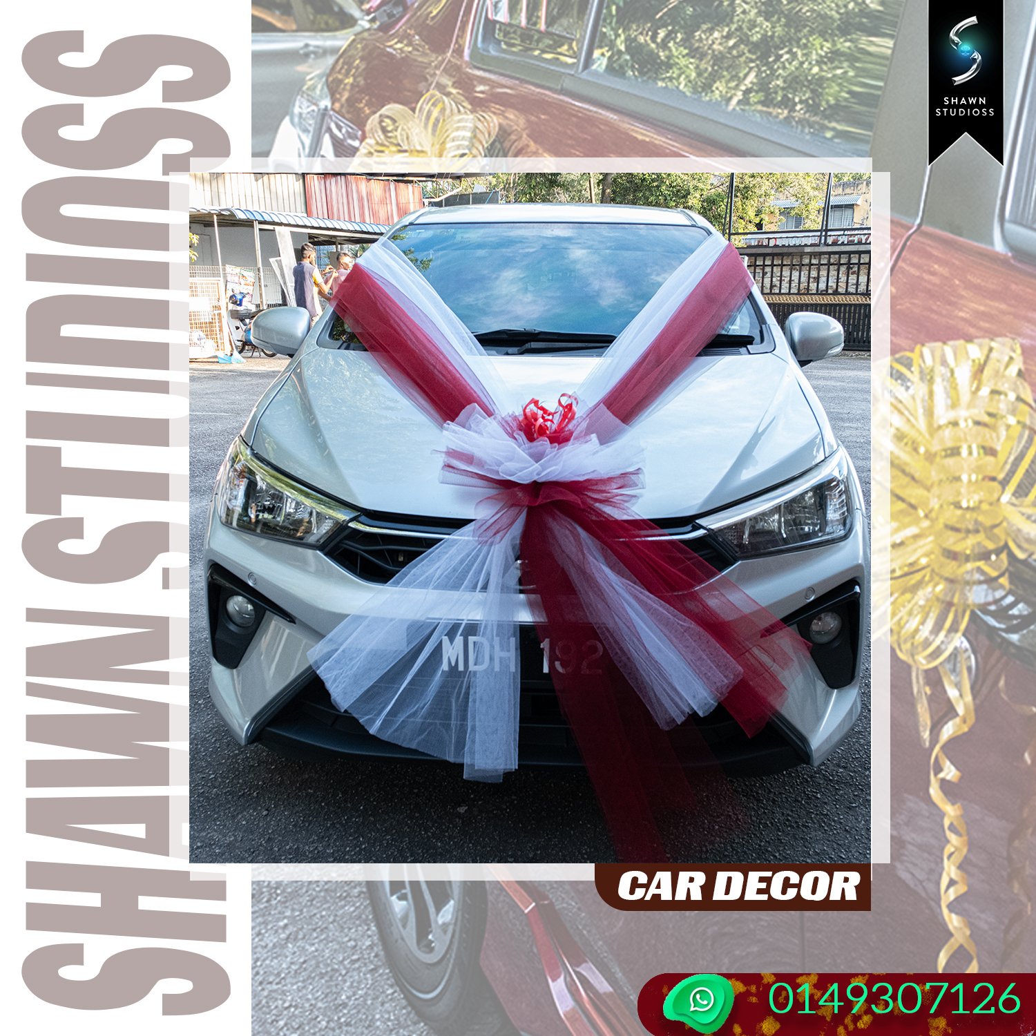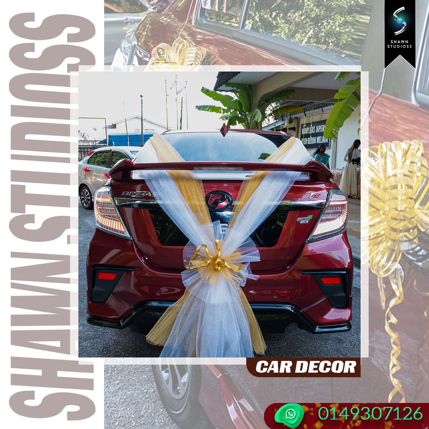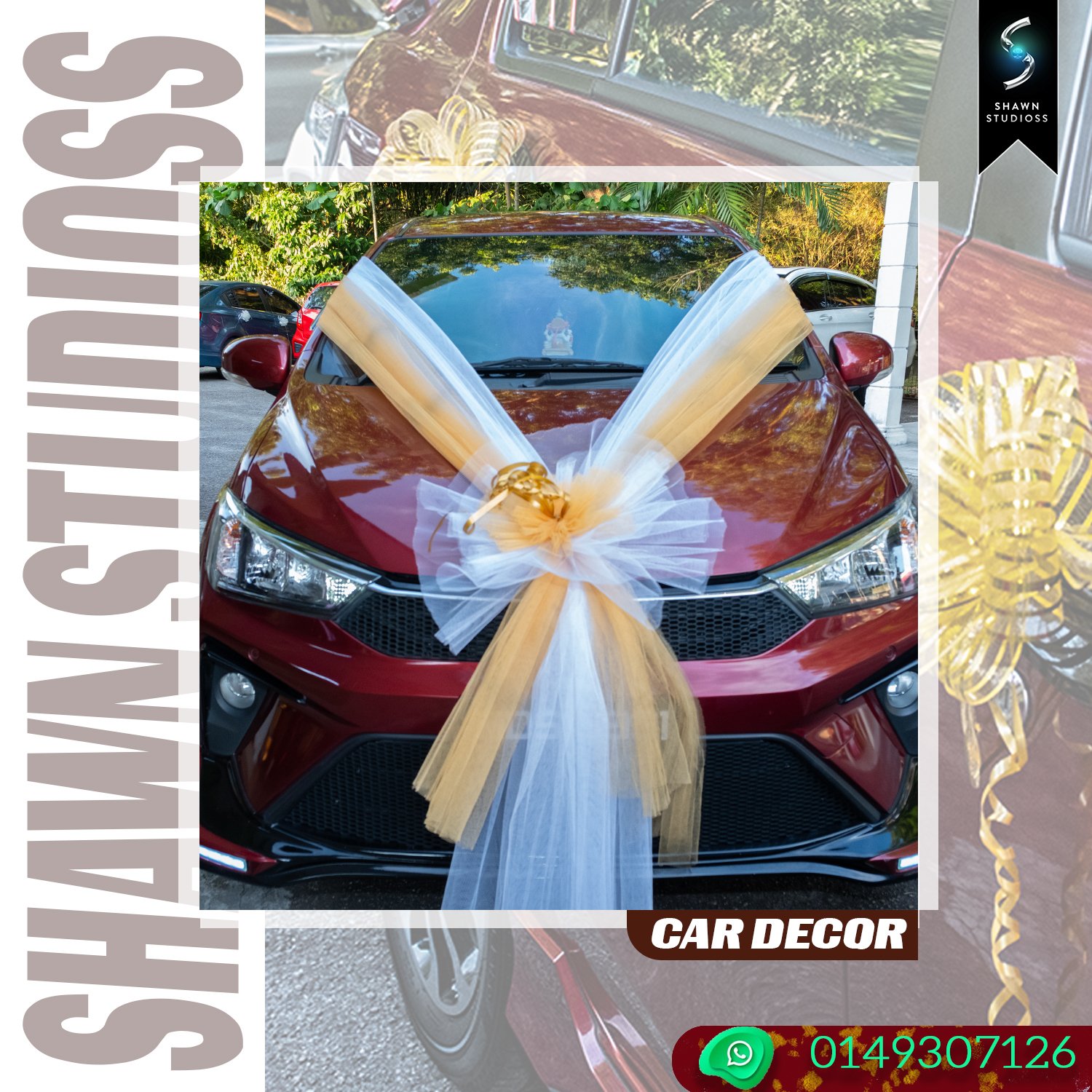 Car Decoration: Custom floral arrangements, cultural ribbons, and traditional Tamil wedding car decor.