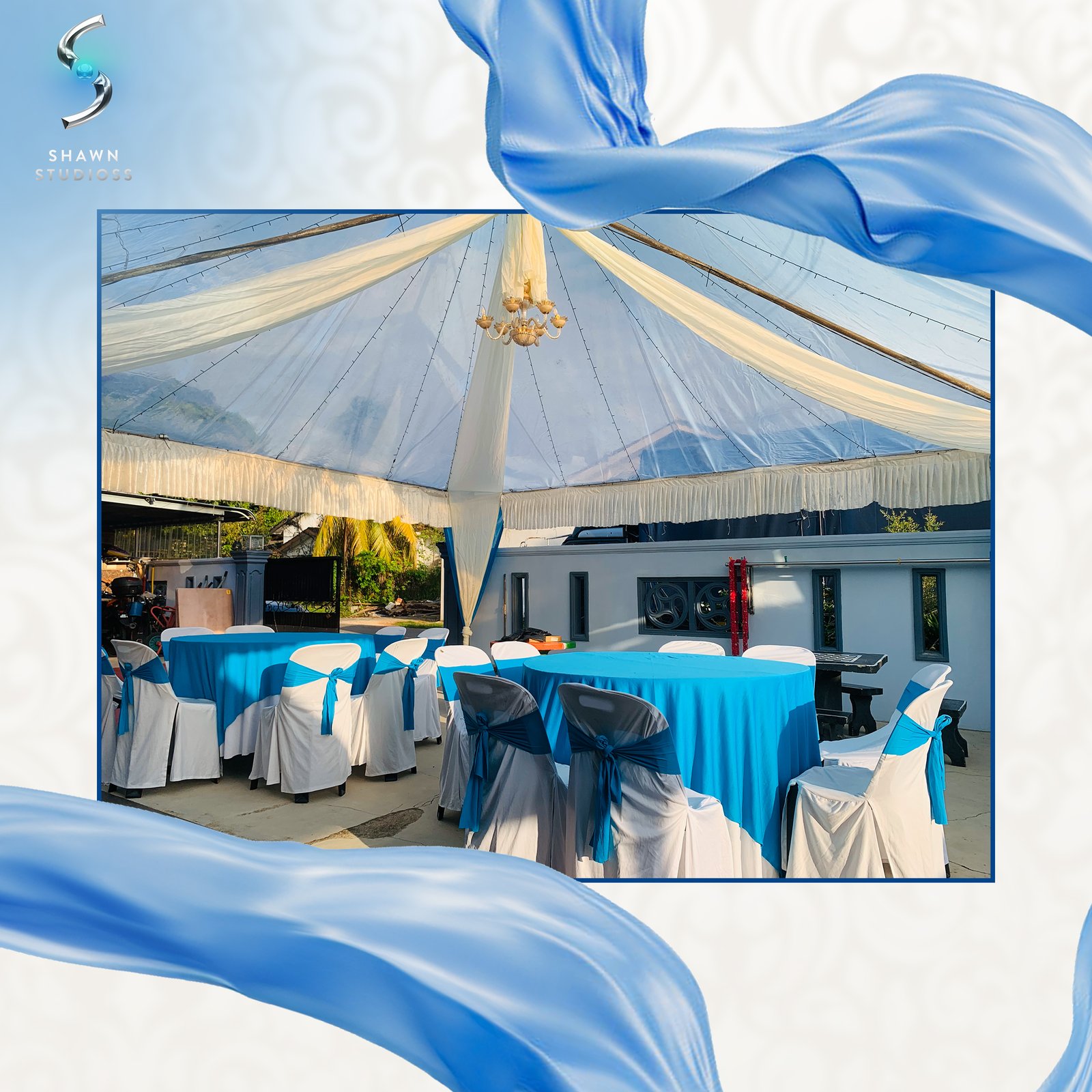 Setup Styles: Scallop draping, underlay lining, and chandelier lighting options.