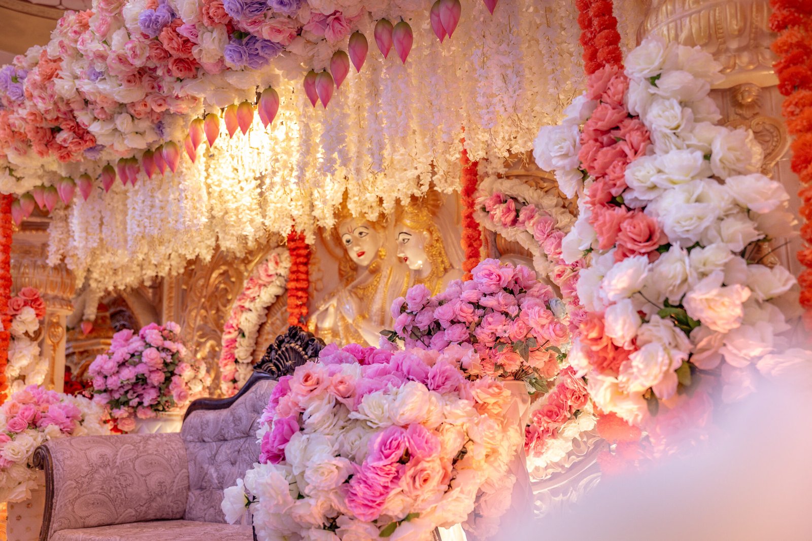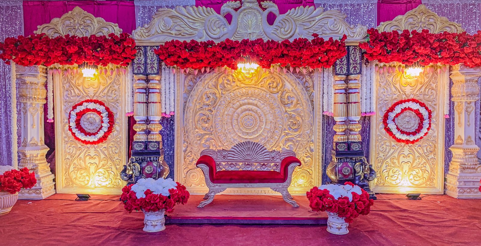 • Custom Designs: We offer a range of styles including the Traditional Temple Mandap (rich golds, pillars, and marigolds), the Modern Floral Mandap (pastels, hanging wisteria, and open structures), and the Royal Palace Mandap (grand domes and velvet drapes).
